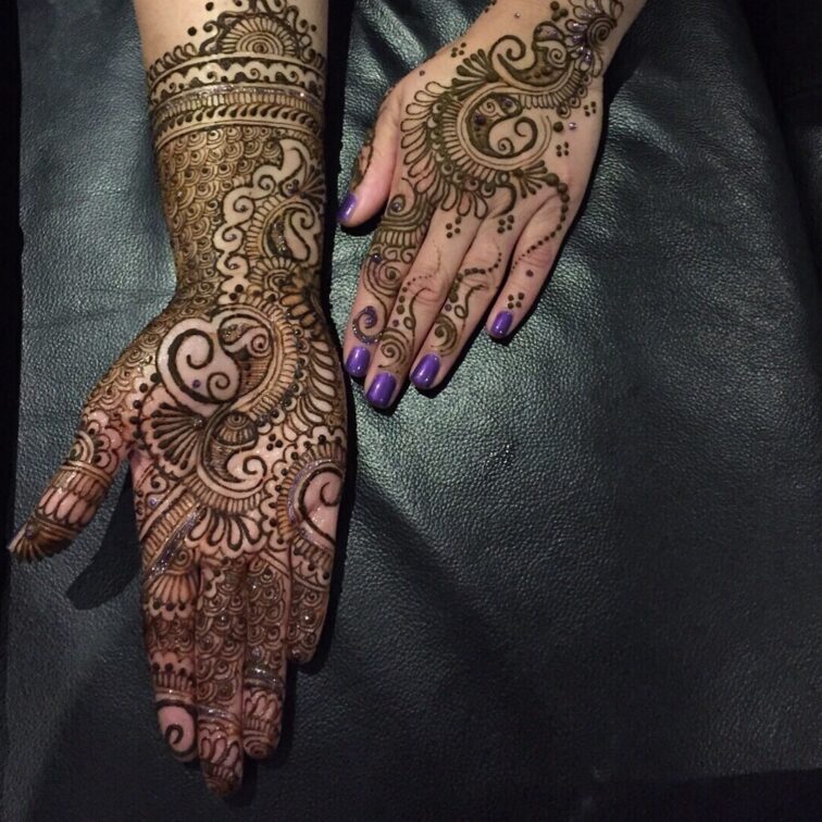 This took place for a wedding celebration full of food, dancing, and more tea. Henna is temporary body art which is also called Mehndi. It can dye skin, hair, fingernails, and fabric. In many cultures wedding henna is still a tradition and an important custom. Henna gives blessings to the bride of joy and luck. The designs are custom-made for every client and can last up to 2 weeks.